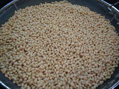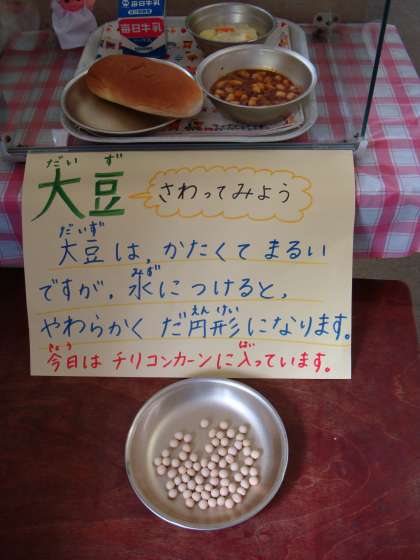 チリコンカーンに入っている大豆はかたくて丸い形をしていますが,沸騰したたっぷりのお湯に30分つけて煮ると,やわらかく,楕円形になります。大きさも2,3倍になり,実際に大豆を見た子どもたちは驚いていました。