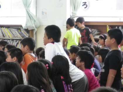 そらいろ学級と1〜3年生が対象でした。絵本の広場はたくさんの子どもたちでいっぱいになりましたが,子どもたちは読み聞かせが始まると身を乗り出して絵本に注目していました。
