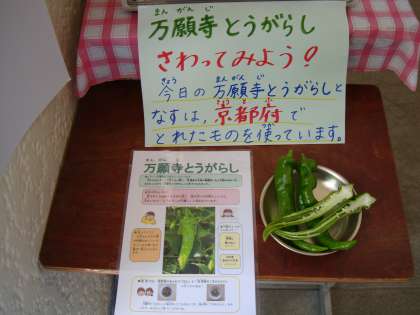 万願寺とうがらしは,6月から8月の夏の時期がおいしく,給食では今日のほかに,7月8日の「京野菜のごまみそかけ」の中に登場します。お楽しみに!