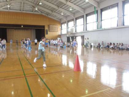 ボールがいちばん後ろまでわたされると、最後の人はボールをもって遠く離れたコーンをめざし走ります!その瞬間、チーム全体から「ダッシュ!!」「がんばれ!いけー!!!」と応援の声がたくさん聞こえて大盛り上がりとなります。走っている子も、ここぞとばかりに猛ダッシュ!