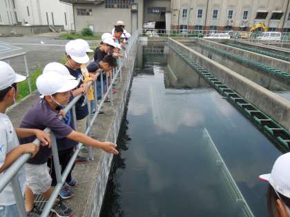 こちらはフロック形成池というところです。簡単に言うと水中の汚れを薬品の力で固めていくところです。いろいろな機械が動いているのを見ました。まだまだ水の汚れが見えます。どんどん見学はすすんでいきます。
