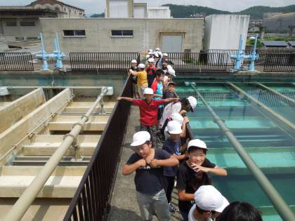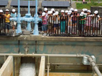 こちらは急速ろ過池です。ここまでくると,だいぶ水がきれいになっています。ここで水をろ過するそうです。しかも,今日はこのろ過池の砂と砂利の洗浄を見せていただきました。一気にくる水の量の多さに,みんな歓声をあげていました。