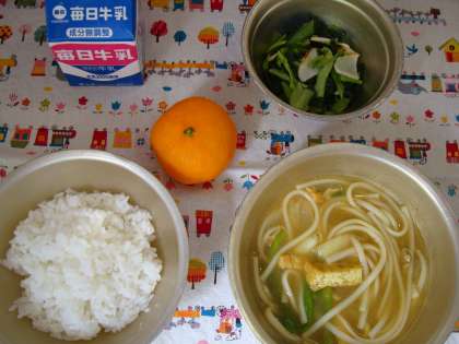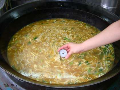 うどんがのびないように,子どもたちが給食を取りに来る時間から逆算して仕上げます。うどんの芯が残っているような固めの状態では,汁と合わせたときに汁を吸ってのびやすくなるので,芯が残らないようにゆでています。
