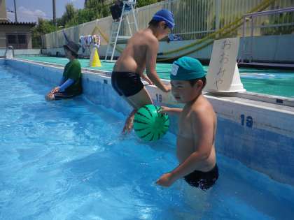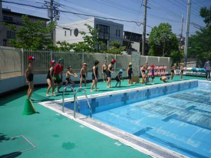 準備体操をしたら,みんなでプールの周りをぐるぐる回りました。大宮小学校で言う「洗濯機」です。
