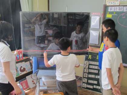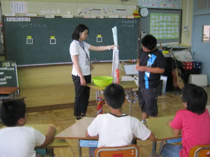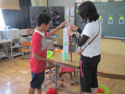 特にみんなのお気に入りは,「ボールを入れて何個分か」で長さを比べる,その名も「長さ比べマシーン」!!長さを調べたい物を横に並べて,「これはボール5個分くらいだな」と予想をしながら注目して調べています。
