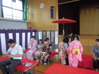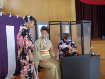 また、地域女性会の皆様にお世話いただいたお茶席でも、茶道部の子どもたちが教わりながら、日頃練習していたお点前を披露していました。
