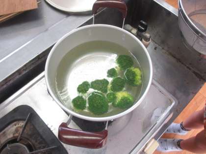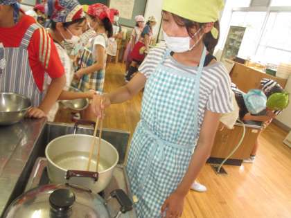 先日の家庭科の学習で、水からゆでるものやお湯からゆでるものを学習しました。にんじんは水からゆでるので、その残り湯で、湯からゆでるキャベツをゆでます。この手順もしっかり教科書で確認したので、上手にできていましたね。