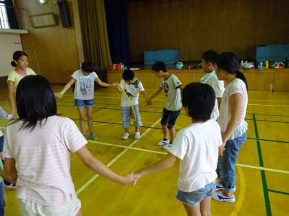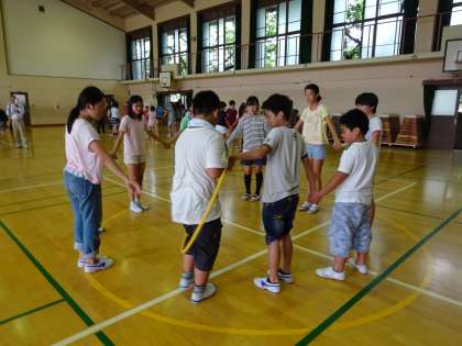 6年生の子どもたちと育成学級の子どもたちがチームになり,手をつないで輪になってフラフープをくぐりました。