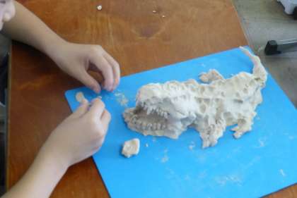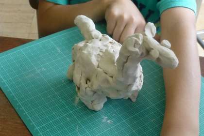 つぎに,一つの粘土のかたまりから首や足などをひねり出して動物をつくりました。