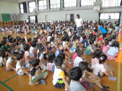 今日、2時間目に、台風が接近し、暴風警報が発令されたことを想定しての避難訓練を実施しました。町別に分かれて集団下校するのか、学校に居残り、保護者に迎えに来ていただくのを待つのか、まずは、自分はどちらなのかを確認しました。そして、町別に分かれて各教室に行きました。学校で待機する子どもたちは体育館に集合です。