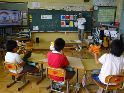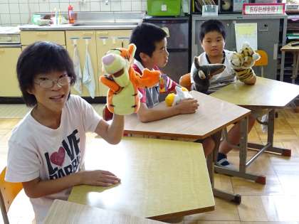英語の授業がありました。歌に合わせて「I am〜.」で自己紹介をしたり,一人一人ぬいぐるみを持って,「I am Wolf.」などぬいぐるみになって自己紹介をしたりしました。「Touch something coler.」というゲームでは,英語で言われた色をタッチして椅子に座ります。楽しい学習を通して子どもたちに英語が身についていってほしいと思います。