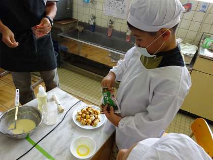 夏休みにある「なかよしステイ」に向けて,今日は夕ご飯のたこ焼き作りの練習をしました。たこ焼きをくるっとひっくり返すのが難しく,竹串を2本使ってひっくり返す子もいれば,1本でひょいひょいとひっくり返す手馴れた子もいました。家でのお手伝いは大切だと感じました。焼けたたこ焼きに,青海苔をかけたり,ソースをかけたり,鰹節をかけたり,全部子どもたちの手でしました。