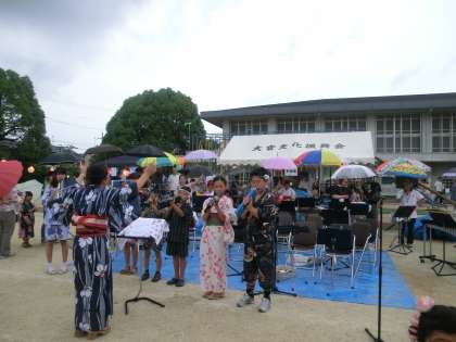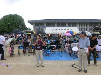 ぱらぱらと小雨が降る中,大宮小学校合奏部のオープニングにより,盛大にふれあい夏祭りが開催されました。会場の皆さんの笑顔で,お天気なんか吹き飛ばしましょう。