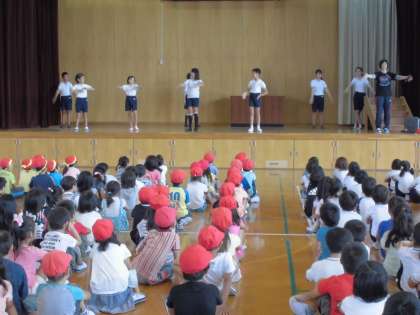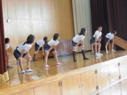 準備運動の係りの高学年の子どもたちがステージに上がり、見本を見せてくれました。