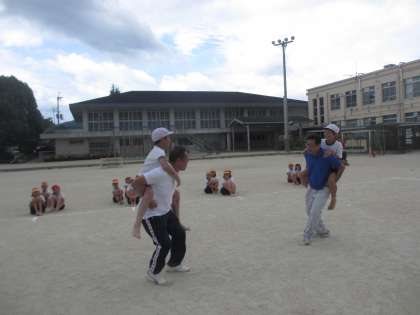 運動会でする大宮無双(騎馬戦)の練習をしました。本番は6年生にも手伝ってもらう予定です。6年生のいない今日は、6年生の代わりに・・・教頭先生と木下先生に騎馬を頼んでの練習です!いつもと違う雰囲気、楽しんでいましたね。