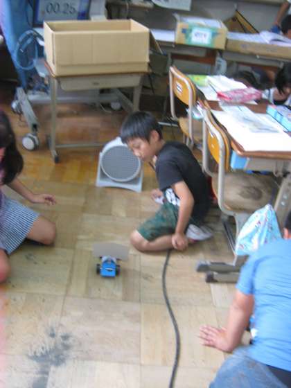 理科の学習では,風の力を使って,車が動く距離を調べました。帆の形や大きさを工夫して,たくさん進む方法を考えました。