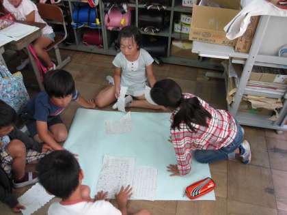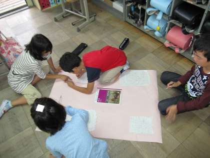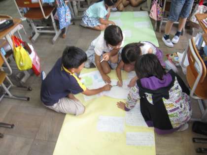 社会科の授業では,スーパーマーケットの見学に行って分かったことや発見した工夫をグループごとに模造紙にまとめています。来週の参観日に発表をするので,それに向けてどのグループも協力して取り組んでいました。