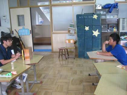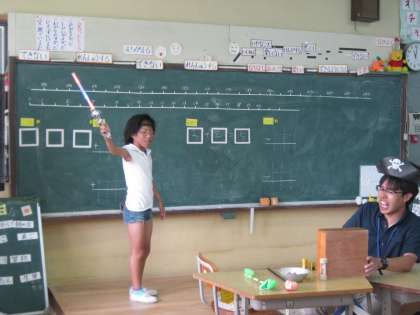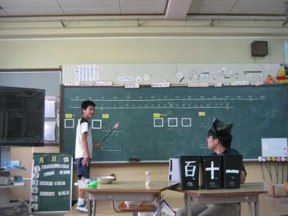 算数の数の学習をしました。数ブロックを見て,黒板に式を書き,計算して,数直線上に答えを表します。そして,みんなの前で式と答えを発表します。みんな,海賊が出題してくる課題について一生懸命考えて挑戦していました。