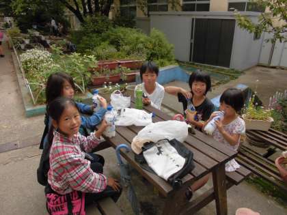 中庭でちょっと一息いれる子どもたちの様子も見られます。おまつりの間は雨も降らずよかったですね。
