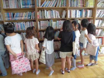 2年生は読書。本を借りて帰ります。みんな「読書バッグ」をもっています。