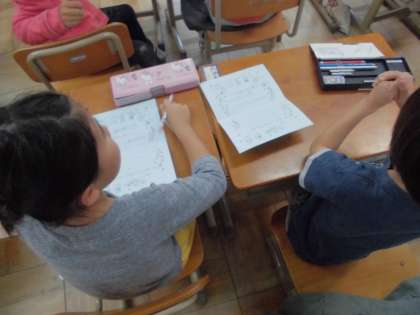 1年生は、学習発表会の招待状をつくっています。地域のおじいさん、おばあさんに学習発表会に来ていただこうとお誘いのカードを作っていました。