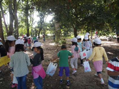 「学校のどんぐりとは,また形が違うなぁ!」などと話しながら,みんな夢中になって拾いました!