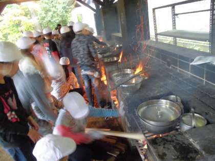 雨が降っているせいで、マキも新聞も湿っています。火がなかなかうまくつけられません。かまど係は四苦八苦。