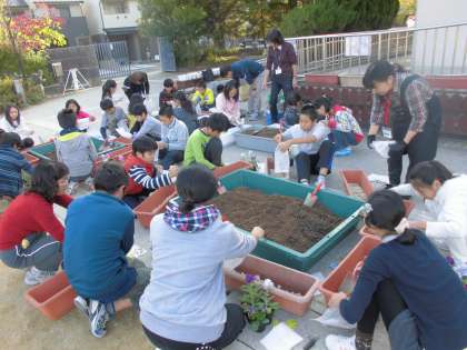 今日6時間目の委員会活動では、園芸委員会の24人の子どもたちが、美しい花やこれから咲く球根を植え付けました。