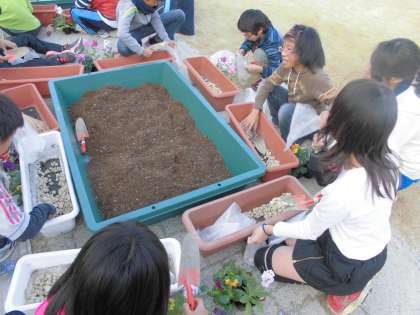 これは、花育活動といって、生花株式会社のご厚意で行われるものです。家庭園芸普及協会グリーンアドバイザーの方を講師に迎え、季節の花の寄せ植えを一人一人が制作しました。大宮校の正門に飾ります。心こめて世話をして、美しい花を咲かせようね。