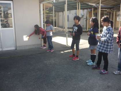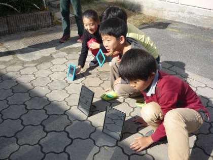 光のすすみ方を調べる実験をしました。光は,鏡ではねかえるとどのように進むのかな?と,予想を立ててから実験しました。子ども達の予想は,「まっすぐはねかえる」「くの字に曲がって進む」「太陽の光と反対側に進む」など…。さてさて,結果は…?