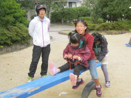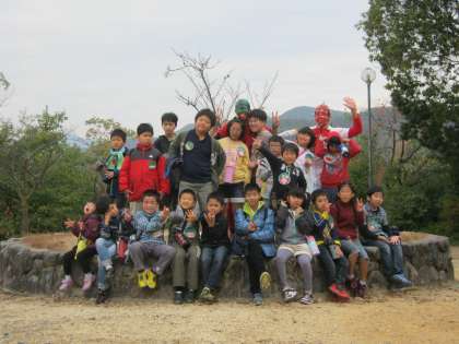そして,頂上でみんなと記念撮影をしたり,落ちているドングリやシイノミ拾いに夢中になりました。広場では,みんなで鬼ごっこをしたり,遊具で遊んだりと,いろいろな学校の子どもたちと楽しい時間を過ごすことが出来ました。
