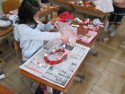 あさがおのつるを丸く輪にして、クリスマスリースをつくりました。おうちから、リボンやモール、ボタンなどかざりになるものを持ってきて、思い思いに仕上げました。すてきなリースができました。おうちに持って帰って飾ってくださいね。