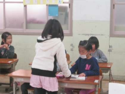 きょう、11月17日5校時、2年生のお兄さん・お姉さんが秋のフェスティバルの招待状を持ってきてくれました。あす、2年生の教室に行って、各コーナーをまわって遊ぶそうです。プレゼントも用意してくれているとか。今から、明日が楽しみの1年生です。