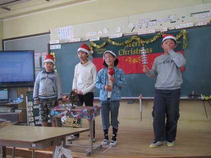 お礼に,そらいろの4人からも,「あわてんぼうのサンタクロース」の歌のプレゼント。歌に合わせて楽器を鳴らすところも褒めていただきました。