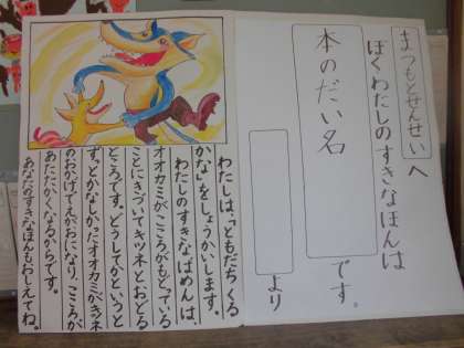 国語の授業で「読書郵便」というおもしろい学習に取り組みました。子どもたちに、先生から読書郵便が届き、自分たちもやってみたいなあと思ったようです。そして、友だちにあてて読書郵便、しかも往復はがきで本の紹介を行いました。