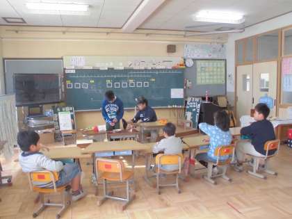 そらいろ学級の授業も見に行きました。算数の学習です。はじめは、同じ課題で進みましたが、途中からはひとりひとりに合った問題を、海賊に扮した先生から渡され、難しい問題にもひとりで挑戦していました。