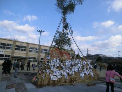 小正月の行事「どんどやき」が行われました。正月飾りや子どもたちの書き初めで飾り付けをした後,10時に点火。どんどやきの火にあたったり,焼いた団子やお餅を食べるとその1年間健康でいられるという言い伝えがあり,無病息災・五穀豊穣を祈る民間伝承行事の一つです。昨日から,この小屋(どんどや)を組み,準備して下さった文化振興会の方々を始め,大宮小PTA,学校運営協議会の皆様,ありがとうございました。