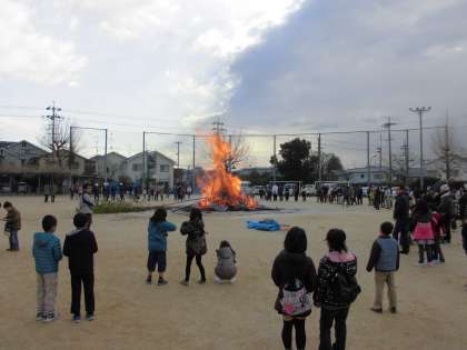 お話が終わるころ、火がつきます。子どもたちは、それぞれ持ってきたおもちをもって、運動場へ行きました。