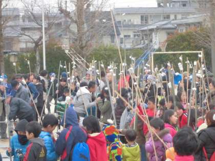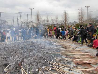 それぞれが持ってきたおもちを、竹のさおの端に針金でくくりつけて、火が消えた灰のなかであたためます。しばらくすると、ちょうどいいぐらいにこんがり焼けたおもちのできあがり。