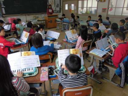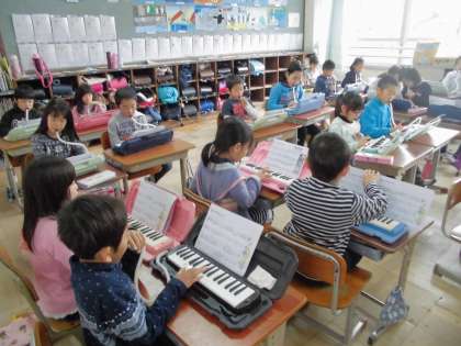 2年生の教室を見て回って、最後は1,2組。どちらも音楽です。鍵盤ハーモニカで演奏しています。2組のみんなは「メヌエット」の曲。このぐらいになると、難しい曲も演奏できるのだなあと感心して聴かせてもらいました。