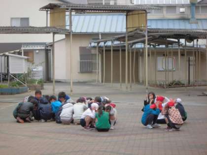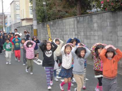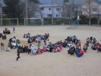 運動場で遊んでいた子どもたちも、びっくりして「今日だったのか」「校舎から離れたところでしゃがんだらいいはずやった」と言いつつ、運動場の真中に集まって頭を守る姿が見られました。運動場からは、少々話声が止みませんでした。反省材料ですね。