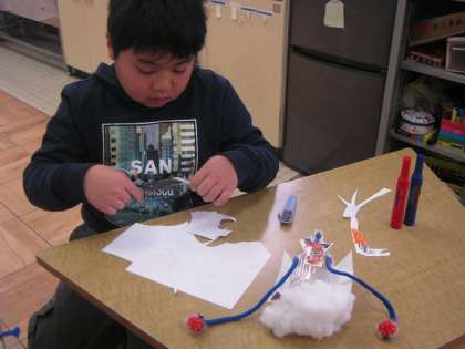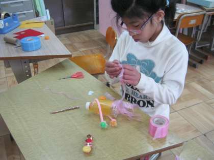 小さなペットボトルに,いろいろな材料を切って貼って,ゆらゆら宇宙人や,筋斗雲に乗った自分など,個性あふれる作品を作りました。