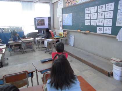 3年生は、おとなりの国、韓国・朝鮮について、ことばや遊びなどの文化を知る学習です。文字は、全く読めないのに、発音を聞くと、なんだか日本語と似ている意味の言葉もあることに気づいていました。お隣で近いからかなと子どもたち。