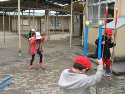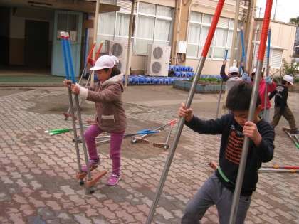 竹馬の練習をしました。入学前に経験のある児童は、うまくバランスをとりながら、進んでいました。はだしで乗ると、歩きやすいようです。また、体育館で練習しましょう。