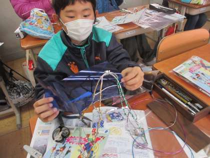 図工の時間には「タワーをたてよう」という単元の学習をしています。針金やカラーシートでタワーを作ります。テーマは「あったらいいな、こんなタワー」です。思い思いのタワーをどんどん作っています。ペンチを使って針金を切るのが初めてだという子もいました。作業中はみんな集中して無言の時間が続きます。針金をくるくると巻いてみたり、モビールを編んでみたり・・・子どもの発想は頼もしいなあと、感心しました。