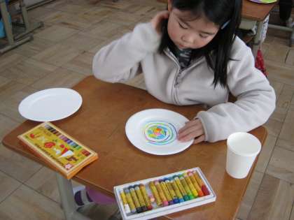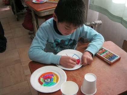 図画工作の学習で、紙コップと紙皿を使ってコロコロと転がっていく仕組みを作りました。転がってきれいにみえる模様を考え、パスで描きました。