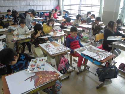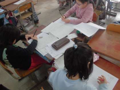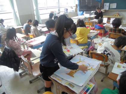3年生の教室をのぞくと、図画の時間でした。「木」を描いているのですが、枝のつき方など、うまくとらえているなあと感心しました。低学年のころとは違った絵画になってきますね。