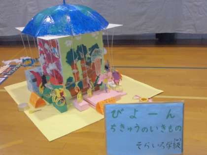 図工展では、1,3,5年生が平面作品。2,4,6年生が立体作品。そらいろ学級は共同作品もあります。
