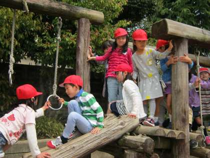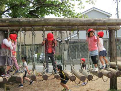 今日は初めて大宮ランドと言う木製遊具で遊びました。丸太渡りや吊り輪、大きな砂場に子どもたちは大喜び!!とってもはしゃいでいました。これからも安全に遊んでいきたいですね。