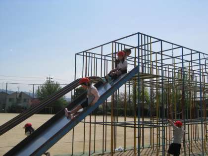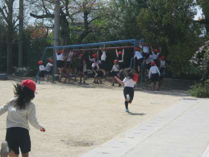 体育で遊具あそびをしています。大ぞうさんの使い方やうんていの遊び方を練習しました。安全に遊べるようになったら、休み時間にも自由に使えるようになります。